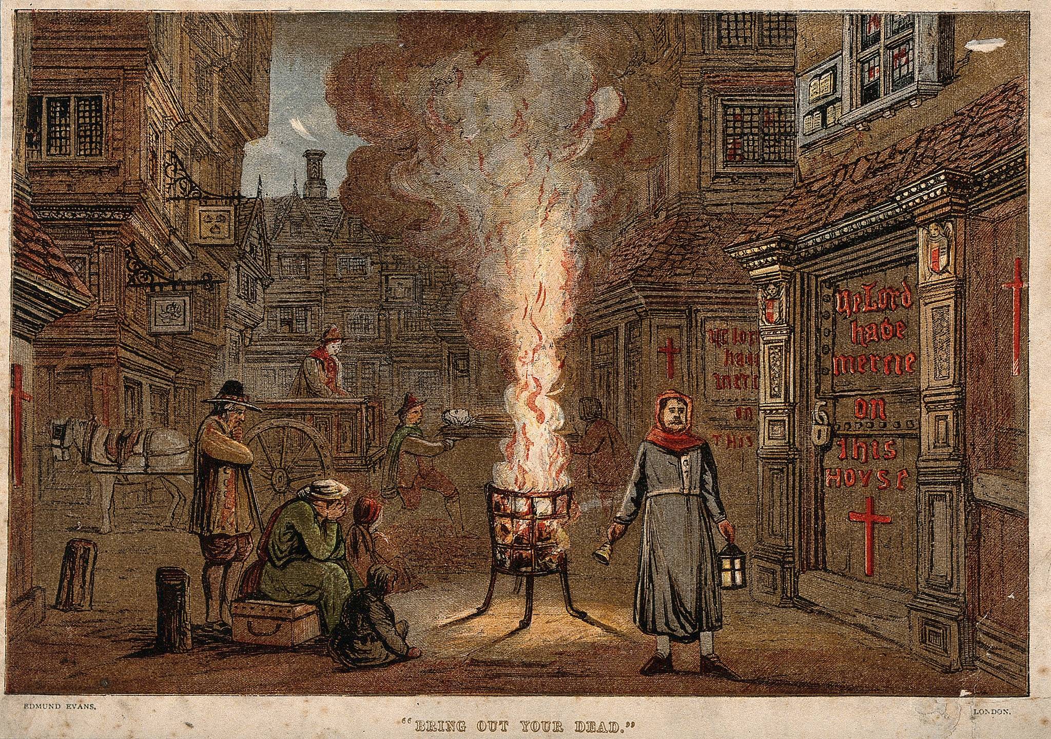 Уличная сцена во время Великой лондонской эпидемии чумы, 1665-1666гг. Повозка смерти на заднем плане, плакальщицы на переднем. “Искатель” справа звонит в колокольчик и кричит: «Выносите своих мертвых». Обратите внимание также на красный крест на двери и слова: “Господи, помилуй этот дом”.